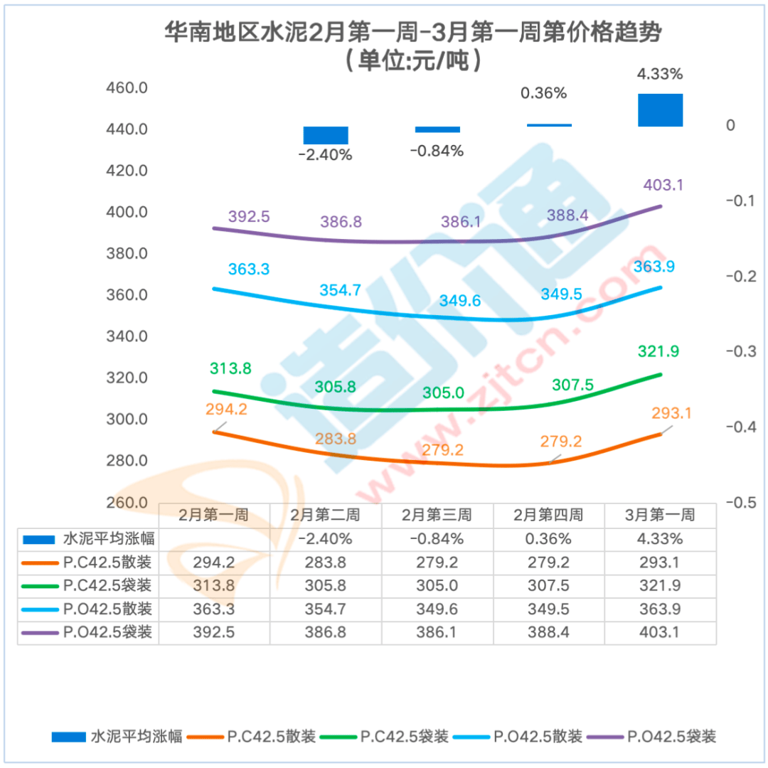 P.O42.5散拆:比来一周华南地域东莞、佛山、广州、江门、深圳P.O42.5 散拆价钱呈上涨态势!