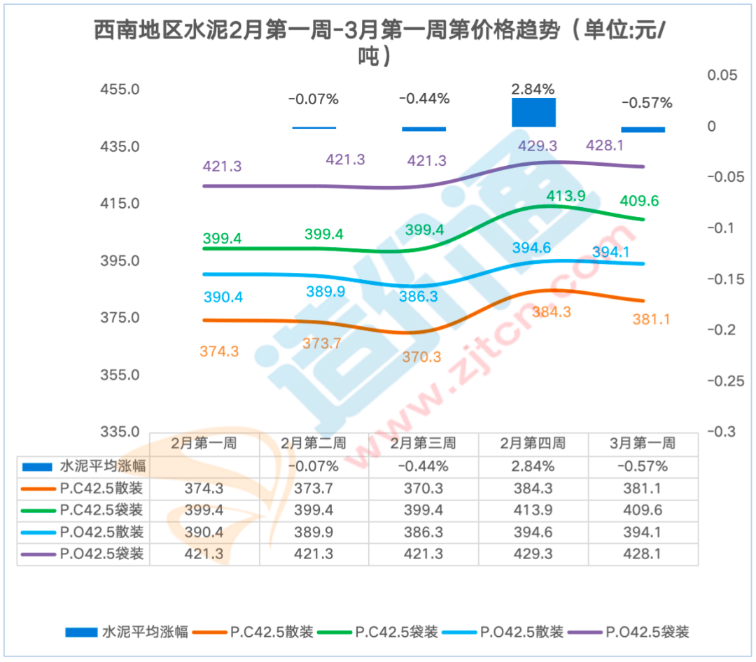 贵阳本周涨跌幅为1.90%,西南地域的水泥2月第一殷勤2月第三周和2月第四殷勤3月第一周呈下跌趋向,