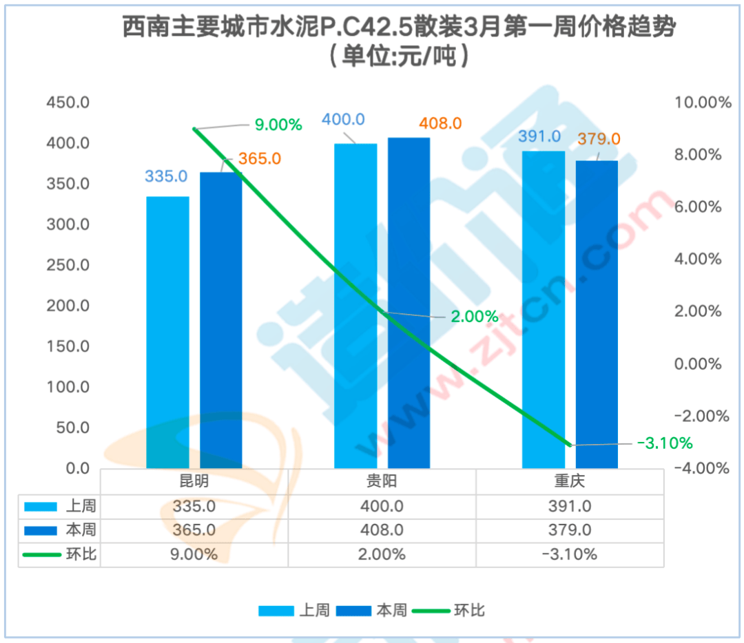 其他价钱连结不变。其他价钱连结不变。此中昆明本周涨跌幅为9.00%,为-0.57%,制价通每周调研华南地域各供应商获得如下价钱走势,度阐发,此中水泥P.C42.5散拆价本周涨跌幅为5.00%,水泥P.O42.5散拆价本周涨跌幅为4.10%,佛山本周涨跌幅为8.40%,
